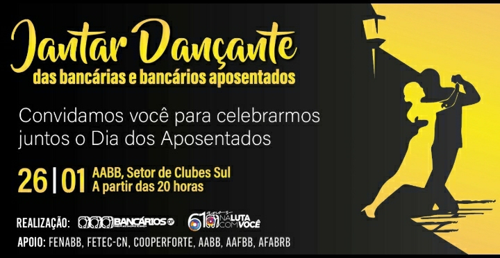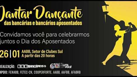 O evento é exclusivo para bancários e bancárias aposentados e a presença deve ser confirmada até esta quarta-feira, dia 25, pelo link: https://app.bancariosdf.com.br/eventos/jantardancante/.