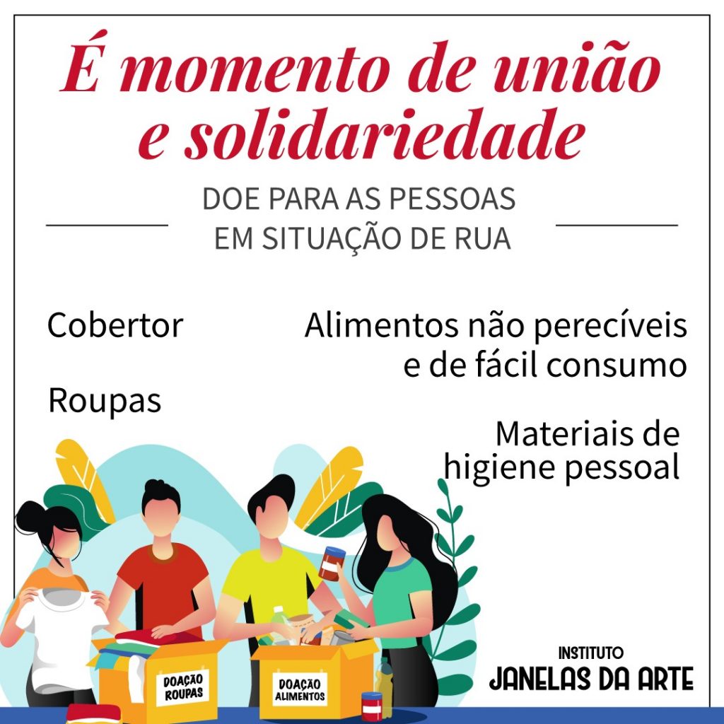 O Instituto Janelas da Arte também está recolhendo doações para ajudar as pessoas que mais precisam. Cobertores, roupas, itens de higiene pessoal e alimentos não perecíveis e de fácil consumo estão na lista de donativos que podem ser entregues no Setor Comercial Sul (SCS), quadra 4, em frente à agência da Caixa e ao lado da Casa da América Latina. Os doadores podem entrar em contato com Jaque (99988.9618), Lorena (98147.1265) ou Maestro Fabiano (99621-9758).