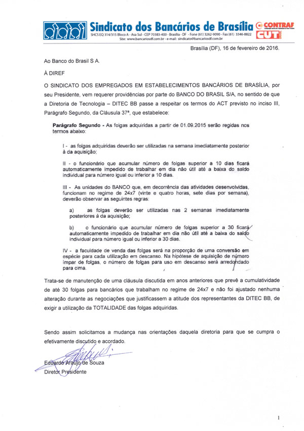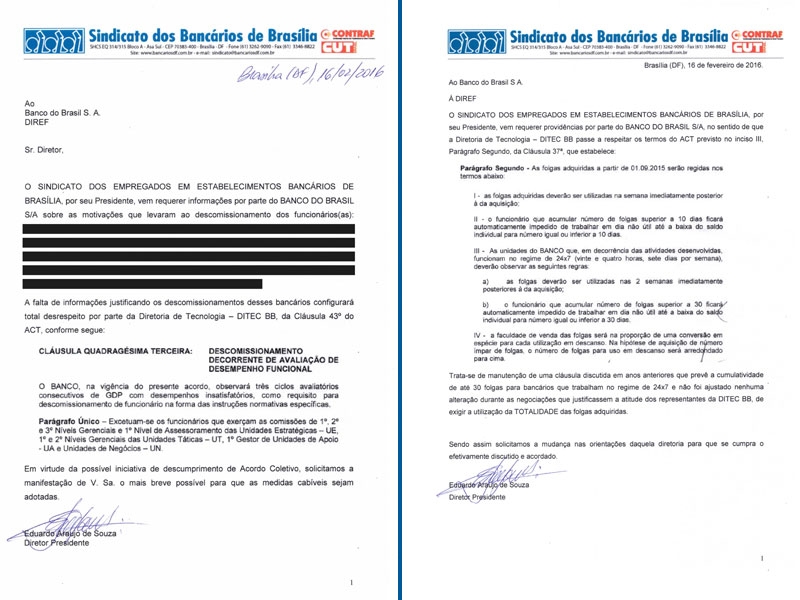 No outro documento, o Sindicato cobra o cumprimento do acordo coletivo por parte da Ditec em relação às normas que regem a concessão de folgas adquiridas a partir de 1º de setembro do ano passado para bancários que trabalham no regime de 24x7.