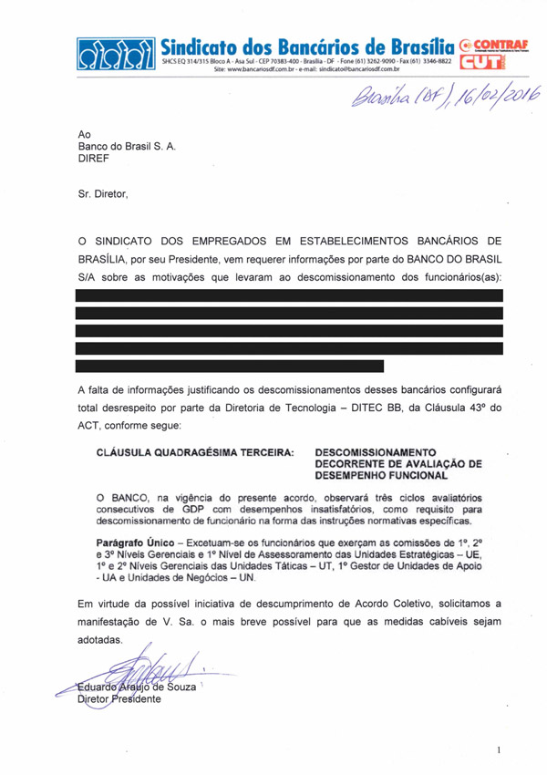 O Sindicato encaminhou nesta quarta-feira (16) dois ofícios, assinados pelo presidente da entidade, Eduardo Araújo, à Diretoria de Relações com Funcionários e Entidades Patrocinadas (Diref) do Banco do Brasil cobrando providências em relação a medidas arbitrárias tomadas pela Diretoria de Tecnologia (Ditec) para com os funcionários.