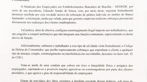 Segundo o documento, a orientação do banco, ainda que não oficializada, tem imposto aos trabalhadores atribuições que não fazem parte de suas funções, caracterizando evidente desvio de função. Além disso, a prática configura constrangimento ilegal, ao forçar os empregados a abordarem clientes inadimplentes em seus locais de residência ou trabalho.