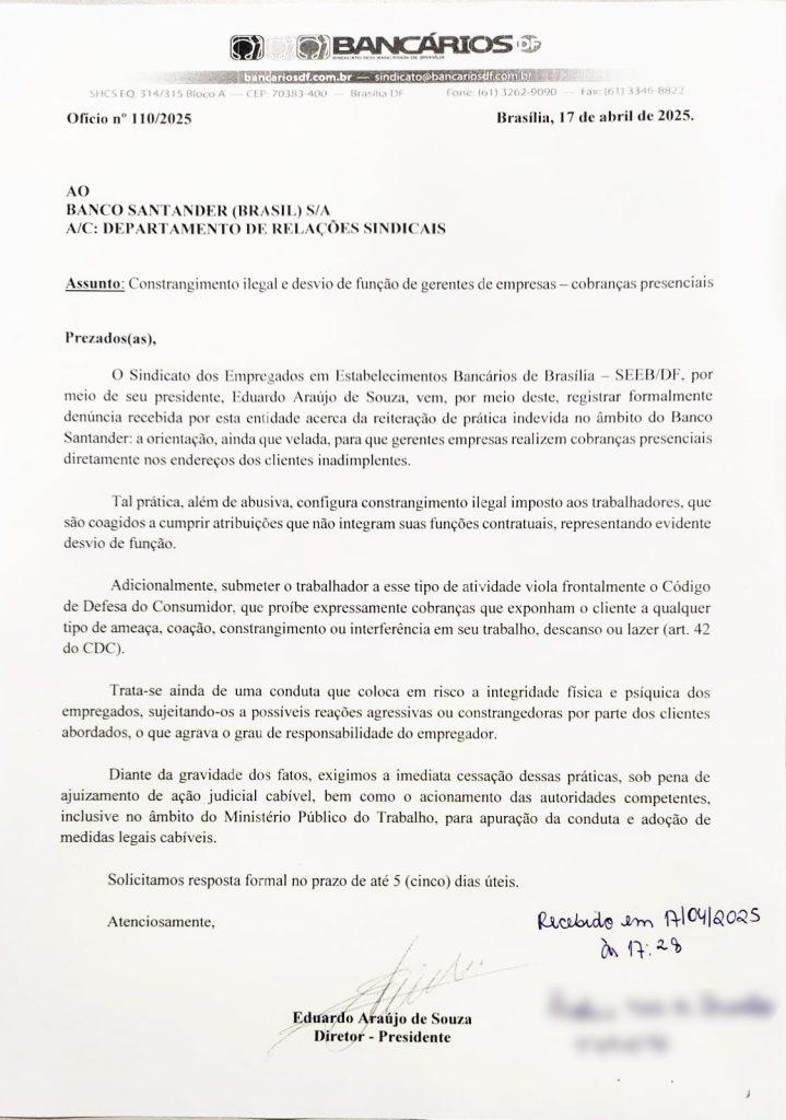 Em ofício encaminhado nesta quinta-feira (17), o Sindicato cobrou do Santander o fim imediato da prática abusiva que obriga gerentes de empresas a realizarem cobranças presenciais diretamente nos endereços de clientes inadimplentes.