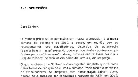 O Sindicato e outras entidades representativas dos trabalhadores enviaram carta na sexta 21 ao novo superintendente de Relações Sindicais do Santander, Luiz Cláudio Xavier, na qual reivindicam o fim das demissões, a geração de novos postos de trabalho, além de criticarem a elevação de bônus destinados aos integrantes do alto escalão no Brasil.