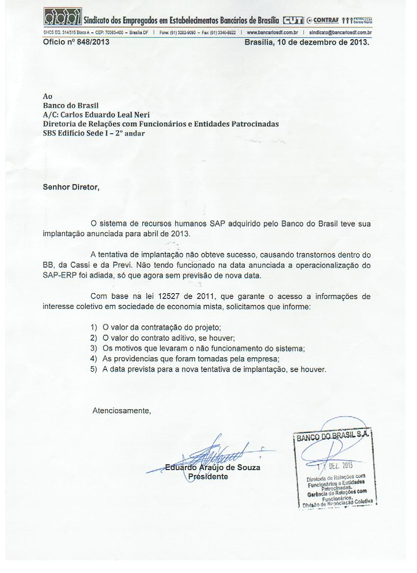 O Sindicato destaca que a falha na implantação do SAP-ERP gera custos ao erário e cobra um posicionamento imediato do BB quanto às questões contidas no ofício.