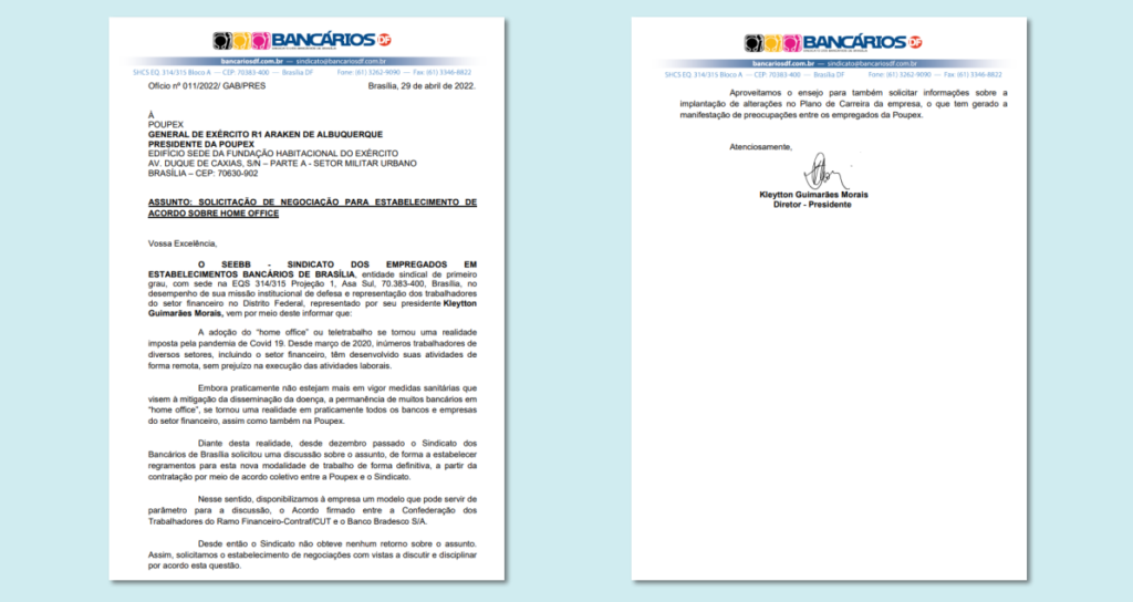“Aproveitamos o ensejo para também solicitar informações sobre a implantação de alterações no Plano de Carreira da empresa, o que tem gerado manifestações de preocupações entre os empregados da Poupex”, conclui Kleytton Morais, presidente do Sindicato.