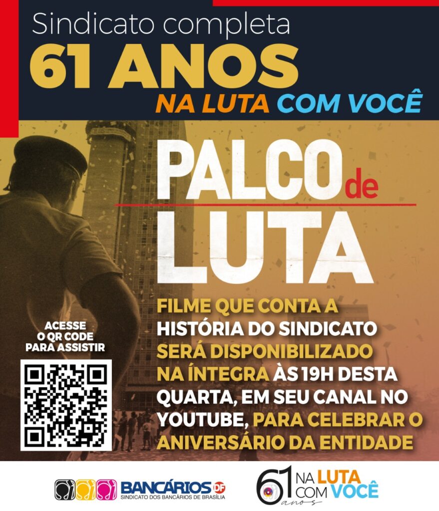 Em celebração à data, que marca o reconhecimento da entidade sindical como legítima representante dos bancários do DF, o Sindicato disponibiliza, a partir das 19h desta quarta-feira (23), o filme ‘Palco de Luta’. A produção, dirigida pelo premiado cineasta brasiliense Iberê Carvalho, faz uma viagem de volta ao passado com depoimentos de grandes personagens da história do Sindicato.
