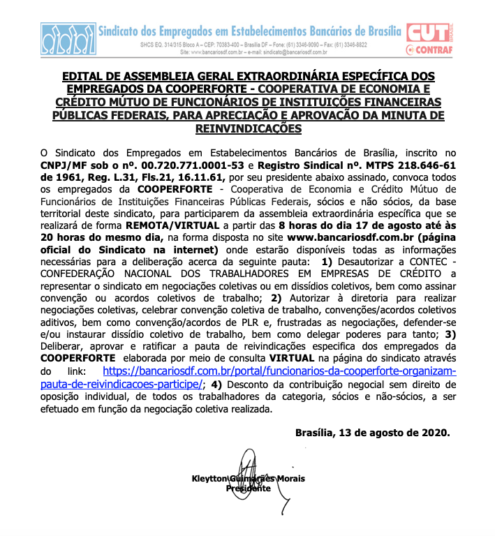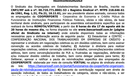 O Sindicato convoca todos os empregados da Cooperforte para participarem da assembleia extraordinária que será realizada de forma virtual, na segunda (17), das 8h às 20h, pelo portal bancariosdf.com.br, para deliberar, aprovar e ratificar a minuta de reivindicações específicas da Campanha 2020 e outros assuntos de interesse da categoria.