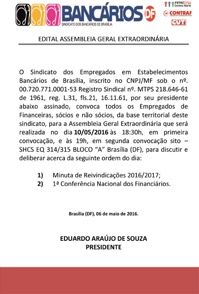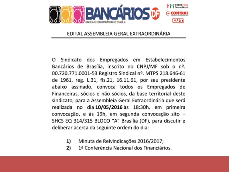 O Sindicato convoca todas as empregadas e empregados de financeiras para assembleia, na terça (10), às 18h30, em primeira convocação, e às 19h, em segunda convocação, em sua sede, para discussão e deliberação da minuta de reivindicações da categoria 2016/2017.