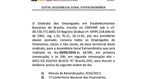 O Sindicato convoca todas as empregadas e empregados de financeiras para assembleia, na terça (10), às 18h30, em primeira convocação, e às 19h, em segunda convocação, em sua sede, para discussão e deliberação da minuta de reivindicações da categoria 2016/2017.