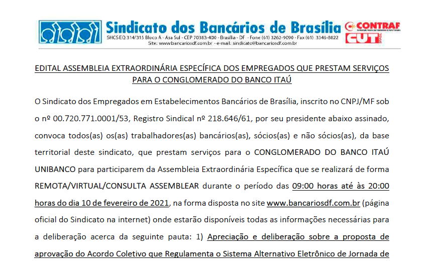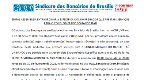 O Sindicato dos Bancários de Brasília convoca os bancários e bancárias do conglomerado Itaú-Unibanco para assembleia extraordinária específica no período das 9h às 20h desta quarta-feira (10).