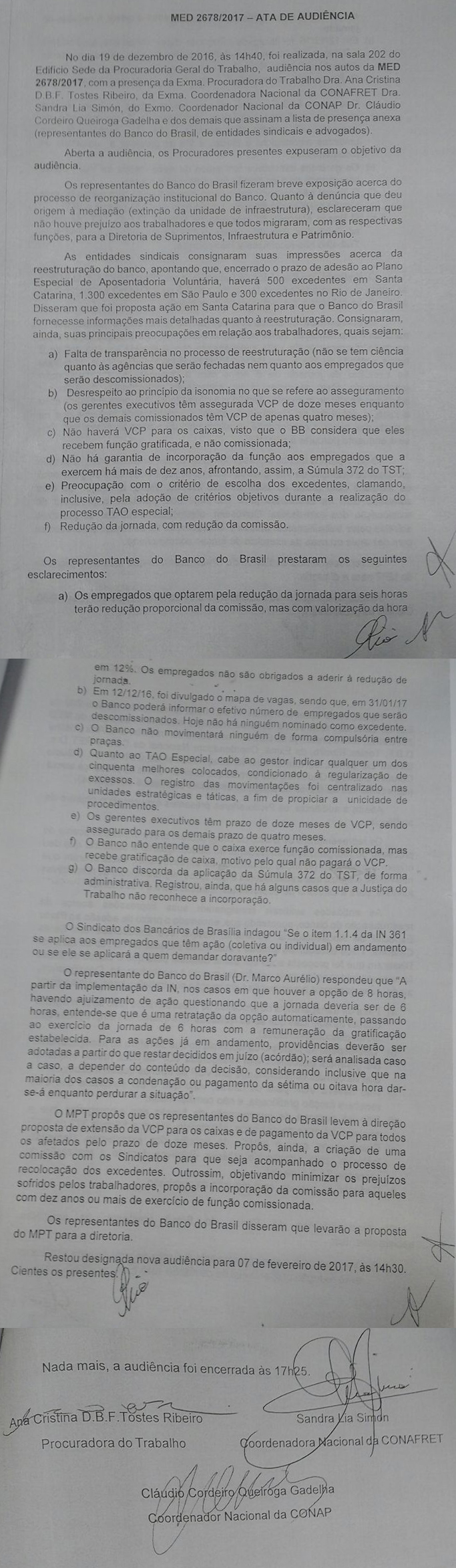 O Sindicato e a Contraf-CUT participaram, nesta segunda-feira (19), de audiência com representantes do Ministério Público do Trabalho (MPT) e do Banco do Brasil para tratar de assuntos relacionados à reestruturação do banco anunciada em novembro, que vai fechar agências e postos de trabalho, cortar cargos e funções e reduzir a jornada de trabalho dos bancários, entre outras medidas.