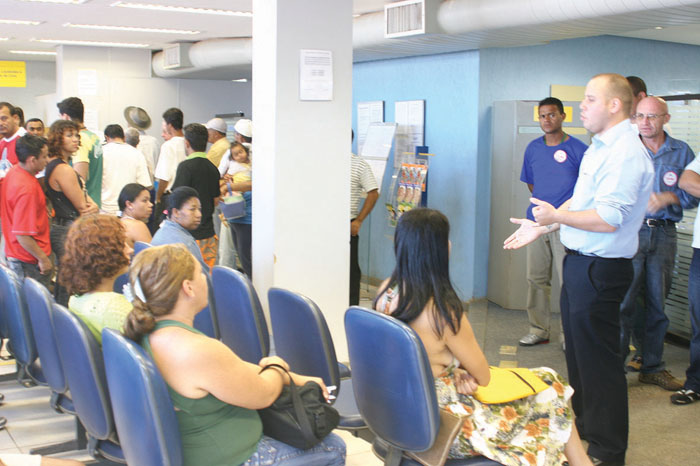Os diretores do Sindicato informaram que numa canetada só a direção do BB reduziu em 4.300 o número de caixas que atendem nos guichês. Essa redução sobrecarrega os bancários e aumenta o tempo de atendimento dos clientes, num completo desrespeito à Lei das Filas (2.457/2000). Para se ter uma idéia da redução, há casos no DF de agências com oito caixas que passarão a ter apenas três. Há locais onde só ficou um caixa para atender toda a clientela, expondo os funcionários a agressões físicas e verbais, destaca Eduardo Araújo, secretário de Imprensa.