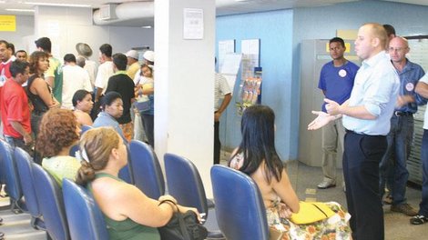 Os diretores do Sindicato informaram que numa canetada só a direção do BB reduziu em 4.300 o número de caixas que atendem nos guichês. Essa redução sobrecarrega os bancários e aumenta o tempo de atendimento dos clientes, num completo desrespeito à Lei das Filas (2.457/2000). Para se ter uma idéia da redução, há casos no DF de agências com oito caixas que passarão a ter apenas três. Há locais onde só ficou um caixa para atender toda a clientela, expondo os funcionários a agressões físicas e verbais, destaca Eduardo Araújo, secretário de Imprensa.