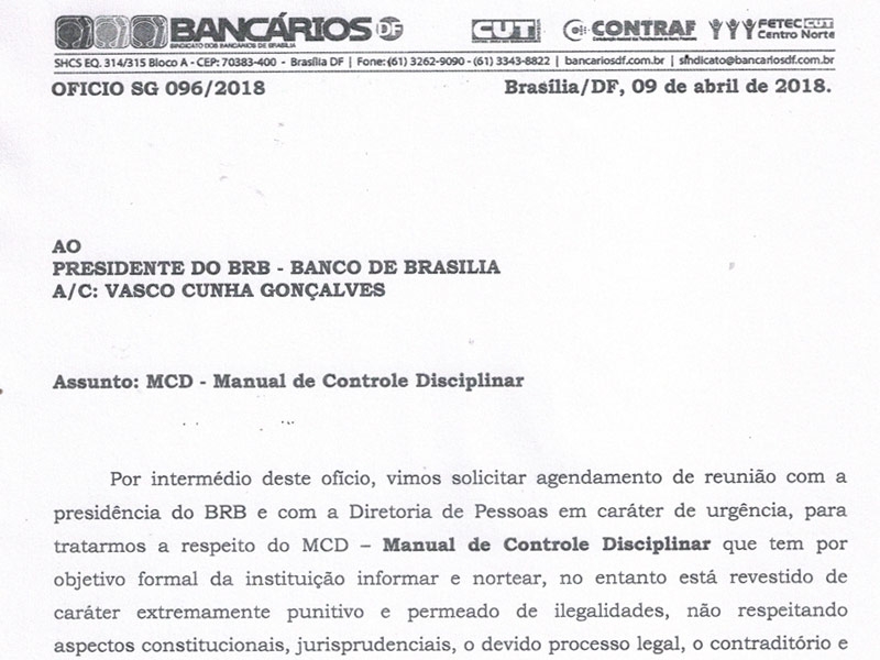 O Sindicato reiterou a necessidade da participação do presidente do BRB no encontro para tratar desse assunto que muito impacta na vida dos funcionários e da instituição. Com itens abusivos e ilegais, o normativo mais parece um mecanismo desproporcional que pode ser utilizado para perseguição e como mordaça dentro da instituição.