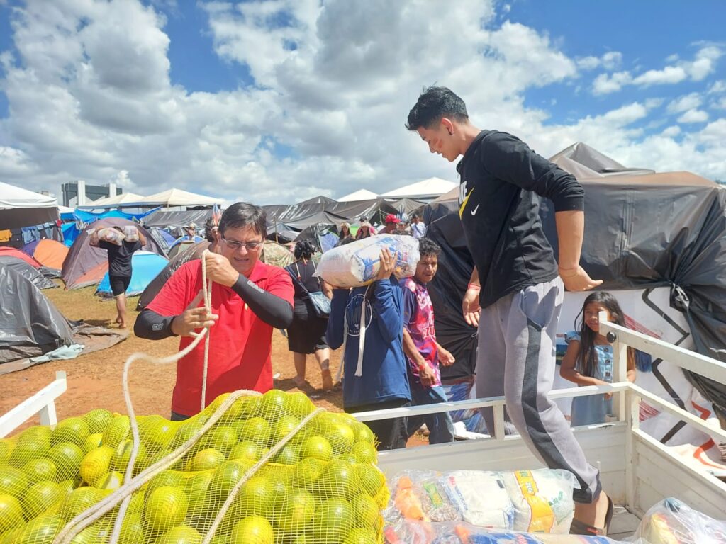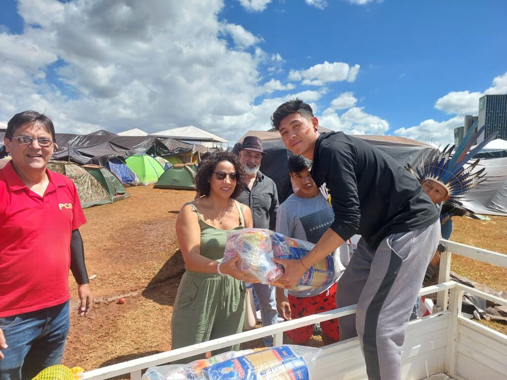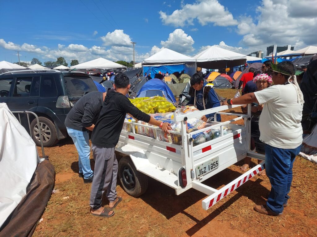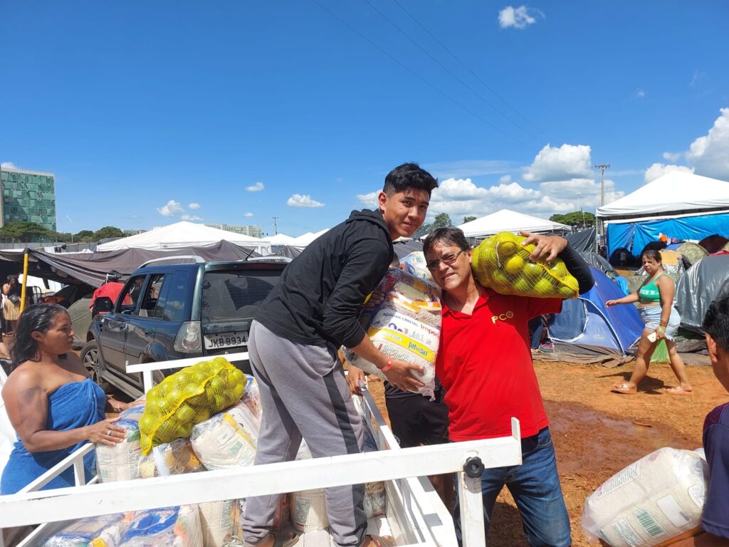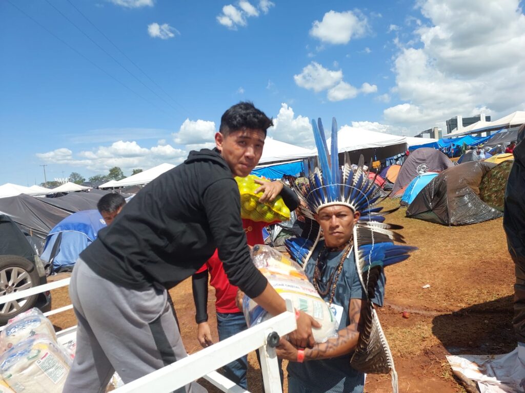 O Sindicato fez na tarde desta quinta-feira (27) a doação de quase uma tonelada de alimentos, além de itens de higiene e limpeza, aos grupos Guarani Nhandeva e Guarani Kaiowá, uma das diversas etnias que estão reunidas na 19ª edição do Acampamento Terra Livre (ATL), a maior mobilização indígena do país, instalado ao lado do Teatro Nacional, em Brasília.