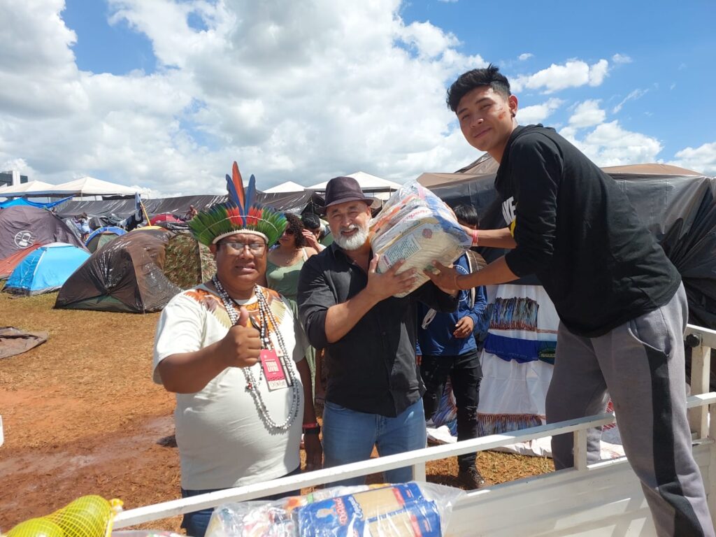 “Agradecemos muito essa doação. Estamos sofrendo muito em nosso território, tendo inclusive 9 pessoas presas sem motivo. Sempre pedindo ajuda para que tomem providência [em relação] a essas pessoas que são nosso sangue. Estamos preocupados e por isso estamos aqui no ATL, pedindo socorro”, denuncia Dionísio Gonçalves, cacique Guarani Nhandeva, do Mato Grosso do Sul, coordenador regional da Articulação dos Povos Indígenas do Brasil (APIB), a responsável pelo Acampamento. “Em nome do Aty Guaçu, agradecemos vocês que dão esse reforço para nós”.