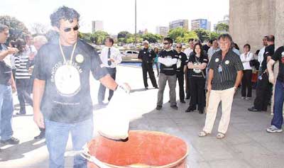 Nesta segunda-feira (17), em função da entrega da pauta de reivindicações específicas à Caixa, a entrada do edifício Matriz I foi novamente palco de protesto dos empregados, em ato convocado pelo Sindicato. Os bancários e bancárias, a maioria vestidos de preto, expressaram indignação com o descaso e o pouco respeito da empresa para com os trabalhadores, em plena campanha salarial.