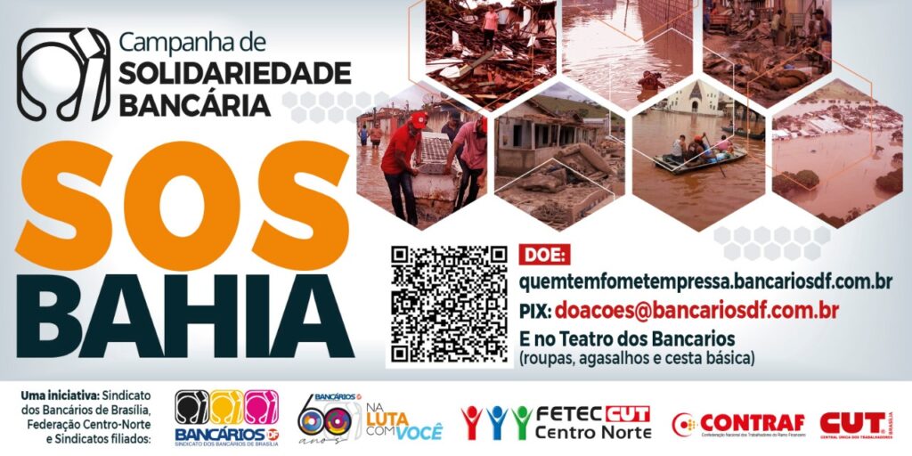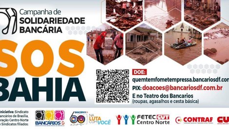 Diante dos estragos causados após as intensas chuvas que atingiram o Sul da Bahia, o Sindicato dos Bancários de Brasília decidiu criar a ação S.O.S Bahia - uma expansão da campanha "Quem tem fome tem pressa". A iniciativa é também da Federação Centro Norte (Fetec-CUT/CN) e conta com apoio da Confederação Nacional dos Trabalhadores do Ramo Financeiro (Contraf-CUT) e da Central Única dos Trabalhadores (CUT).