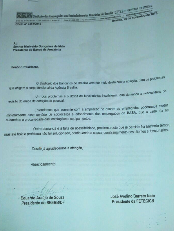 Os problemas tratados na reunião estão elencados em ofício que foi encaminhado pelo Sindicato ao presidente do Basa, no mesmo dia do encontro.