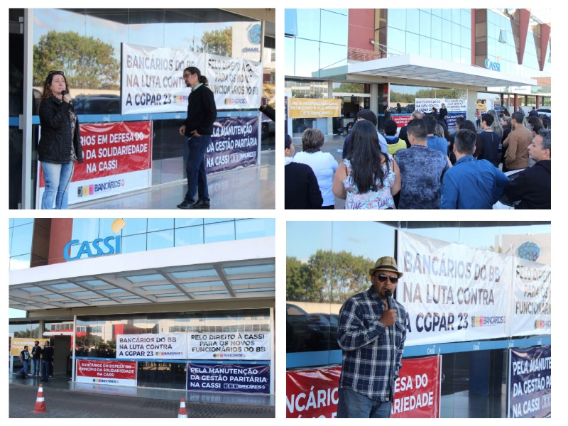 Dando sequência às atividades em defesa da Cassi, o Sindicato promoveu um protesto na manhã desta quinta-feira (21), em frente à sede da Caixa de Assistência, na 613 Sul, onde o Conselho Deliberativo se reúne para votar a proposta apresentada pelo Banco do Brasil que retira direitos e prejudica os associados.