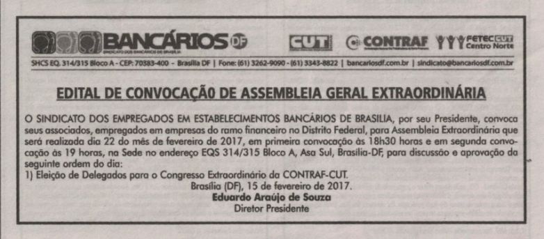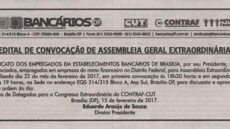 O Sindicato convoca os bancários de todos os bancos públicos e privados para participar da assembleia geral nesta quarta-feira (22), que elegerá delegados para o Congresso Extraordinário da Contraf-CUT. A primeira convocação será às 18h30 e segunda, às 19h, na sede do Sindicato (EQS 314/315 – Bloco A).