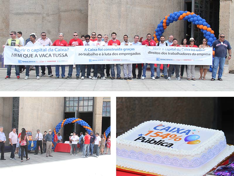 Em referência ao aniversário da Caixa e à importância da manutenção da empresa pública, o Sindicato distribuiu um bolo aos empregados com a frase ‘Caixa 154% pública’.