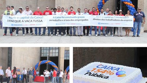 Em referência ao aniversário da Caixa e à importância da manutenção da empresa pública, o Sindicato distribuiu um bolo aos empregados com a frase ‘Caixa 154% pública’.