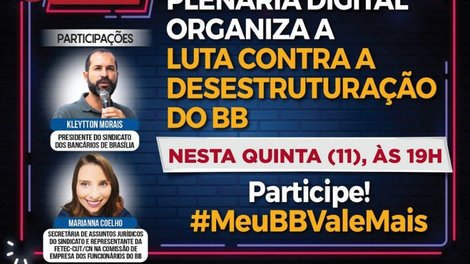 O Sindicato realiza nesta quinta-feira (11), às 19h, uma plenária digital com bancários e bancárias do Banco do Brasil para definir estratégias de luta contra a desestruturação do BB, anunciada pela direção do banco no dia 11 de janeiro.