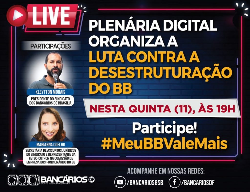 A transmissão poderá ser acompanhada ao vivo pela pelas páginas do Sindicato no Youtube (/bancariosbsb) e Facebook (/bancariosdf).