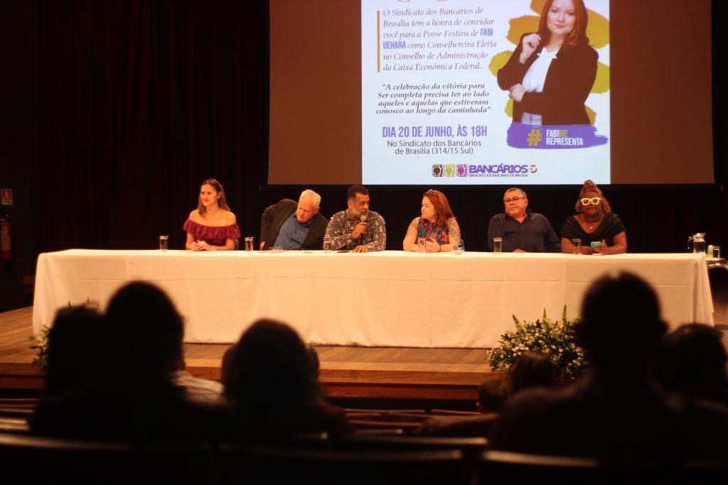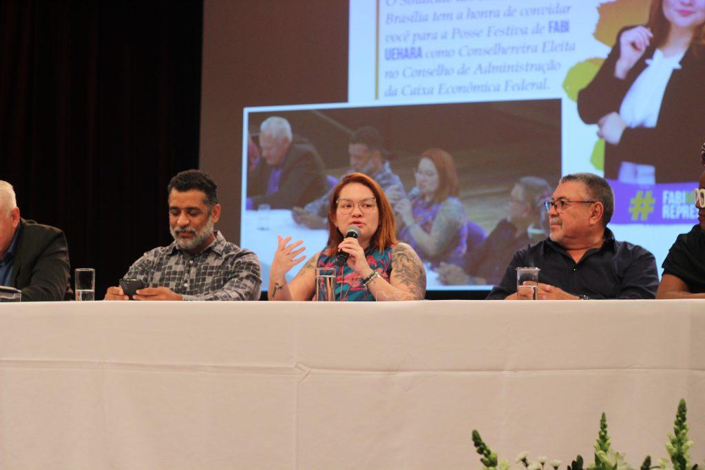 Durante a solenidade, a mesa foi composta pela conselheira eleita, o presidente da APCEF-DF, José Herculano (Bala), o vice-presidente da Fenae, Clotário Cardoso, e Kelly Quirino, Conselheira de Administração eleita do Banco do Brasil. Toda a atividade teve a coordenação do presidente do Sindicato dos Bancários de Brasília, Eduardo Araújo. Todos se manifestaram para uma expressiva plenária que acompanhou todas as atividades.