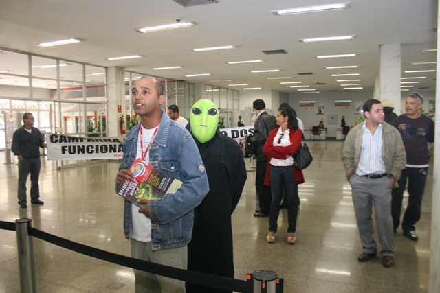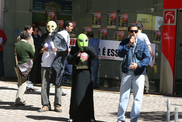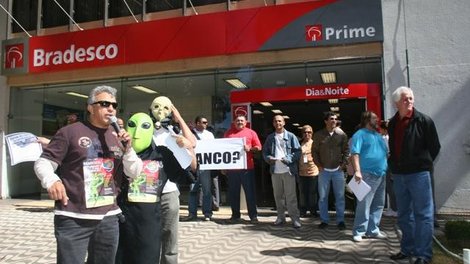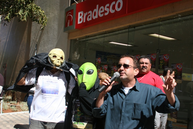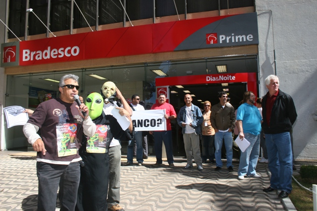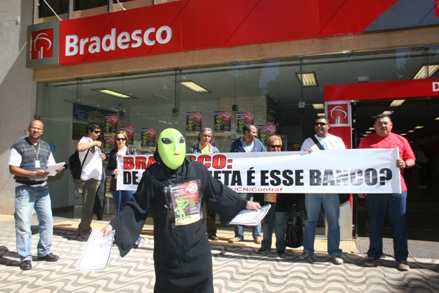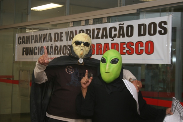 Por conta do mote da campanha - Bradesco: de que planeta é esse banco? -, numa alusão à campanha publicitária Bradesco Banco do Planeta, o Sindicato, nos protestos, tem colocado alienígenas distribuindo notas à população para explicar a intransigência da instituição em negociar com os trabalhadores. O Bradesco se preocupa com campanhas para salvar o planeta, mas esquece de atender necessidades básicas de seus funcionários, critica José Garcia, diretor do Sindicato e funcionário do Bradesco.