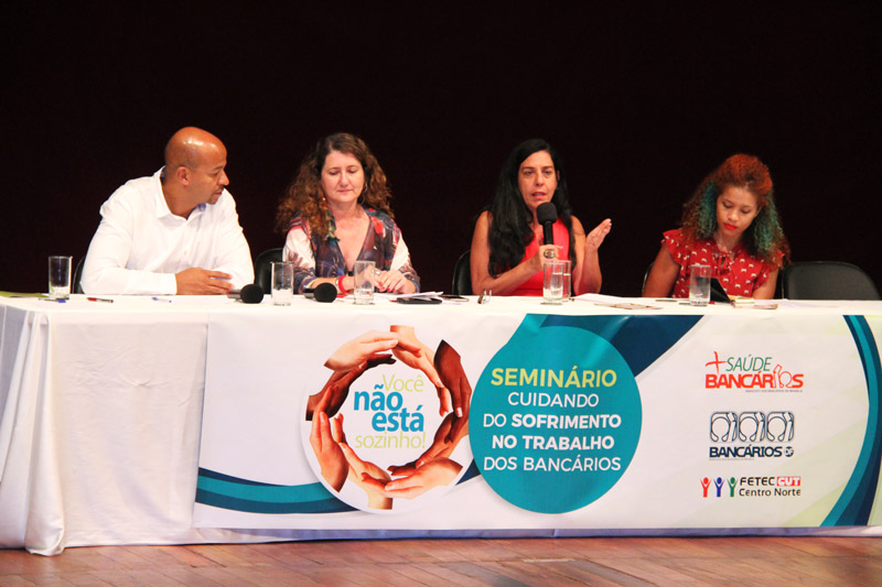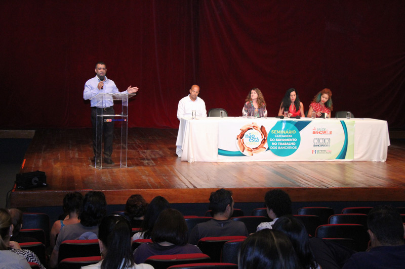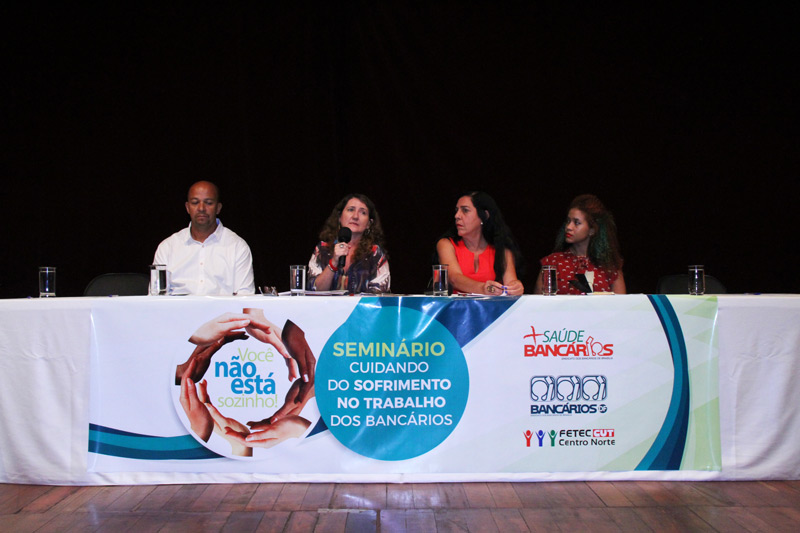 O Sindicato lançou nesta terça-feira (19) a cartilha “Você não está sozinho - Cuidando do sofrimento no trabalho dos bancários”. O material foi apresentado durante o seminário do mesmo tema realizado no Teatro dos Bancários, na sede do Sindicato, com a palestra da professora doutora da Universidade de Brasília (UnB) Ana Magnólia Mendes, que é coordenadora do Grupo de Estudos e Práticas em Clínica, Trabalho e Saúde (Gepsat), e pela psicóloga Fernanda Duarte, responsável pelo Programa de Atenção ao Sofrimento do Bancário no Sindicato.