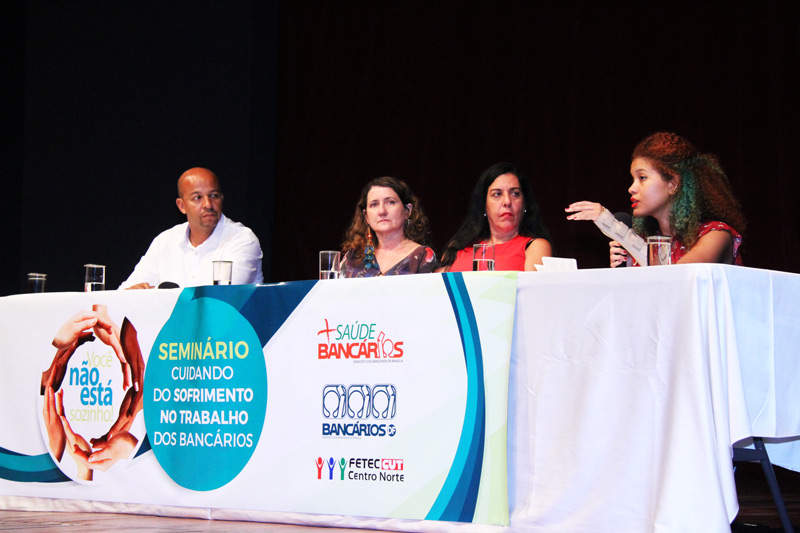 O Sindicato lançou nesta terça-feira (19) a cartilha “Você não está sozinho - Cuidando do sofrimento no trabalho dos bancários”. O material foi apresentado durante o seminário do mesmo tema realizado no Teatro dos Bancários, na sede do Sindicato, com a palestra da professora doutora da Universidade de Brasília (UnB) Ana Magnólia Mendes, que é coordenadora do Grupo de Estudos e Práticas em Clínica, Trabalho e Saúde (Gepsat), e pela psicóloga Fernanda Duarte, responsável pelo Programa de Atenção ao Sofrimento do Bancário no Sindicato.
