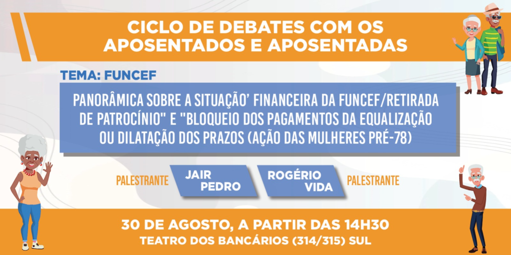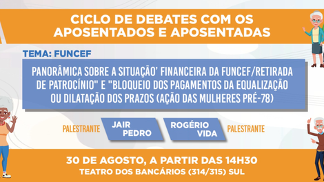 O primeiro debate será sobre a Funcef. Os diretores eleitos Rogério Vida, de Administração e Controladoria, e Jair Pedro, de Benefício, são os palestrantes convidados. Eles vão abordar os temas "Panorâmica sobre a situação financeira da Funcef/retirada de patrocínio" e "Bloqueio dos pagamentos da equalização ou dilatação dos prazos (ação das mulheres pré-78)".
