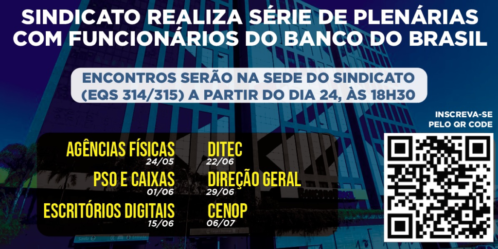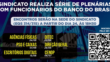 O Sindicato vai realizar uma série de plenárias setoriais semanais com grupos específicos de funcionários do Banco do Brasil, para debater assuntos relacionados à gestão de pessoas. As reuniões, preparatórias para seminário sobre o BB, ocorrerão na sede da entidade (314/315 Sul), no formato presencial e virtual.