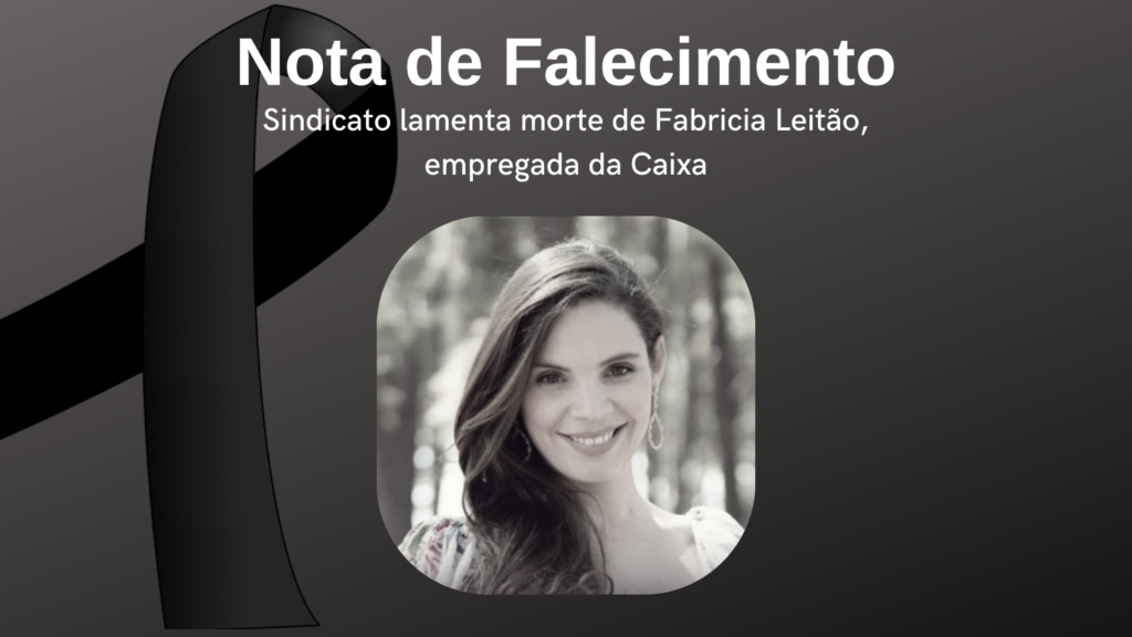 A diretoria do Sindicato comunica e lamenta o falecimento da empregada da Caixa Fabricia Francisca de Oliveira Leitão. Ela trabalhava na auditoria do banco, localizada no edifício Matriz. Fabricia tinha 43 anos, era casada e deixa duas filhas.