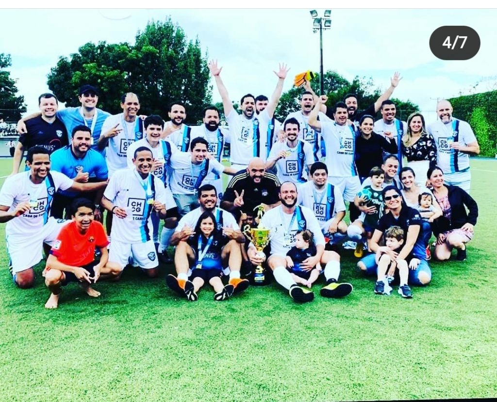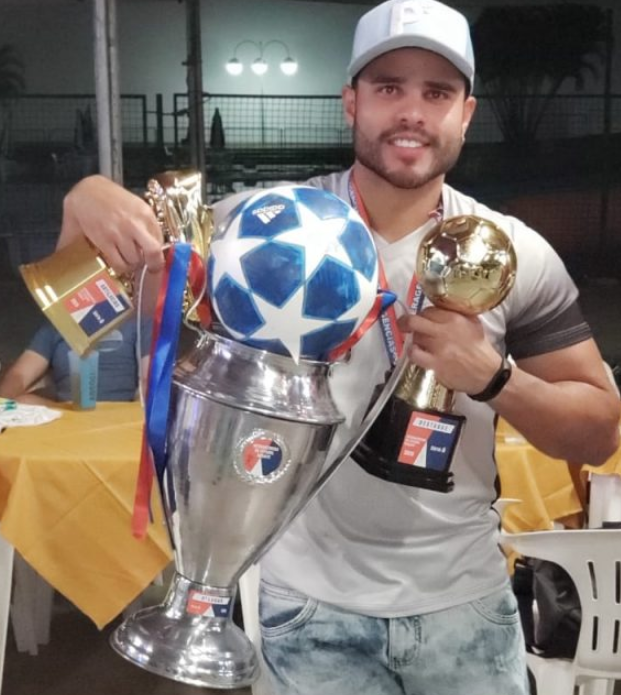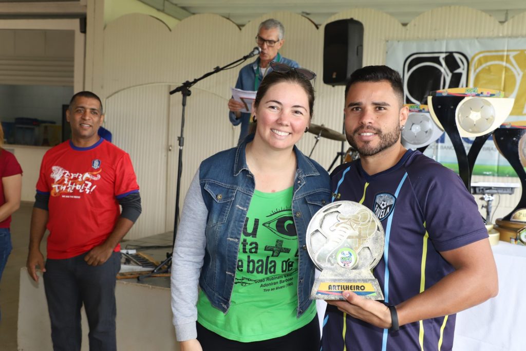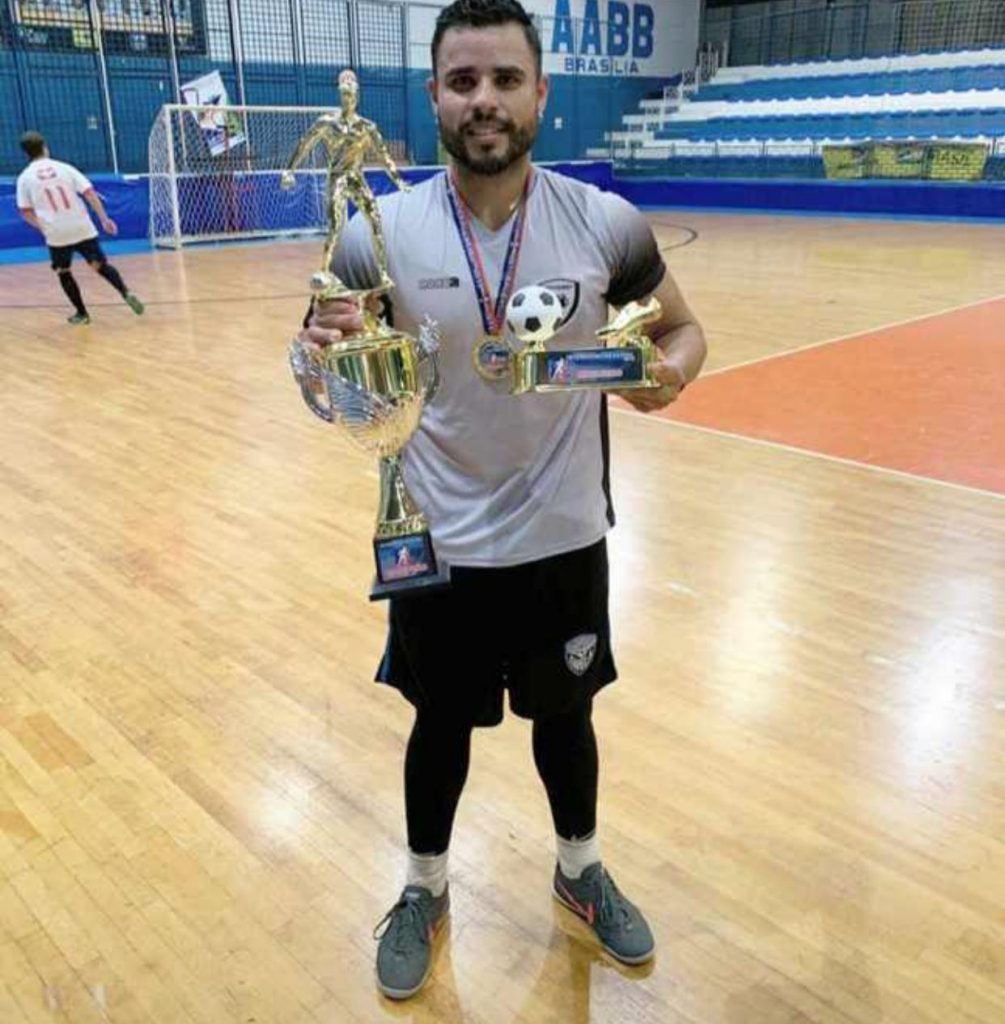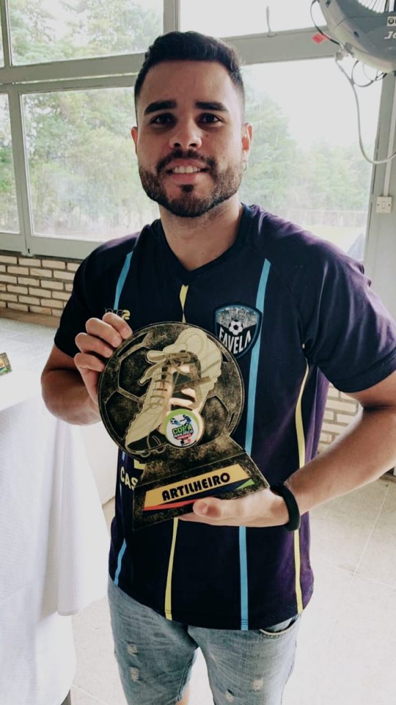 Na foto acima, o registro do momento em que Gabriel recebe, na premiação da final da Copa dos Bancários 2019, o troféu de artilheiro do campeonato, pelo time Favelados. O mesmo registro pode ser conferido na reportagem da TV Bancários a seguir, a partir do tempo 2:36, e a sua entrevista falando da artilharia, com início em 9:43.