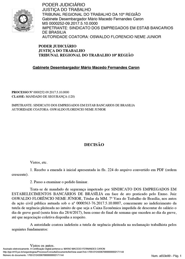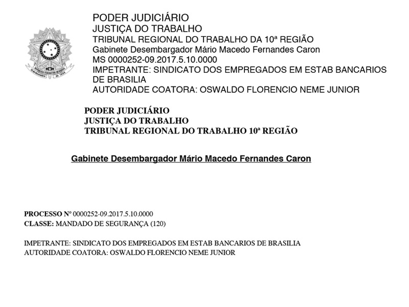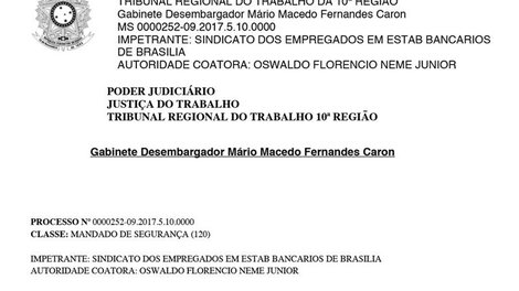 A decisão, proferida em mandado de segurança impetrado pelo Sindicato, é do desembargador Mario Macedo Fernandes Caron, do Tribunal Regional do Trabalho da 10ª Região.