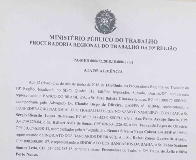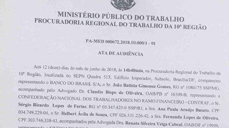 Representantes dos bancários do Banco do Brasil participaram, nesta terça-feira (12), de audiência na Procuradoria Regional do Trabalho da 10ª Região para tratar do descomissionamento de mais de 700 caixas em todo o país. O encontro ocorreu depois de denúncia da Confederação Nacional dos Trabalhadores do Ramo Financeiro (Contraf-CUT).