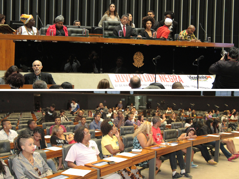 A defesa da juventude negra vítima da violência, do preconceito e da discriminação foi tema de sessão solene, nesta segunda-feira (28), no plenário Ulysses Guimarães, na Câmara dos Deputados. O evento, que contou com a participação do Sindicato, foi uma homenagem ao Dia Internacional pela Eliminação da Discriminação Racial (comemorado em 21 de março), de iniciativa do deputado Vicentinho (PT-SP).