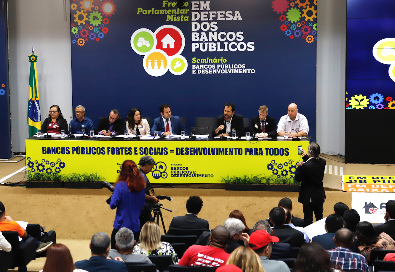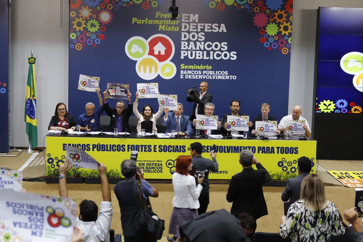 Com 209 assinaturas de parlamentares de 23 partidos diferentes, foi lançada nesta quarta-feira (8), na Câmara dos Deputados, a Frente Parlamentar Mista em Defesa dos Bancos Públicos. A cerimônia, que ocorreu durante o Seminário em Defesa dos Bancos Públicos, reuniu representantes de federações, sindicatos de trabalhadores, entre os quais o Sindicato dos Bancários de Brasília, e entidades da sociedade civil.