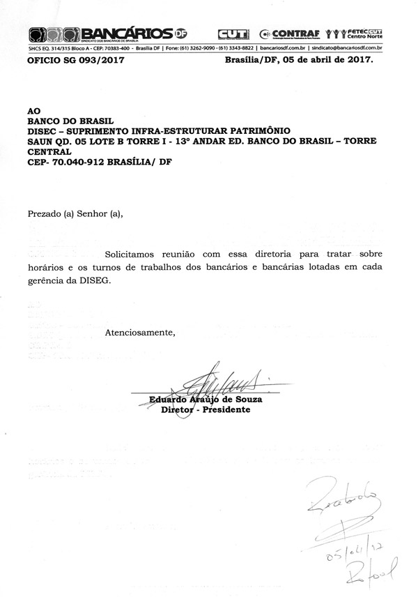 Em ofício encaminhado ao Banco do Brasil na quarta-feira (5), o Sindicato solicitou reunião com a Diretoria de Suprimentos Corporativos e Patrimônio (Disec) da empresa para tratar do horário de trabalho dos funcionários do setor.