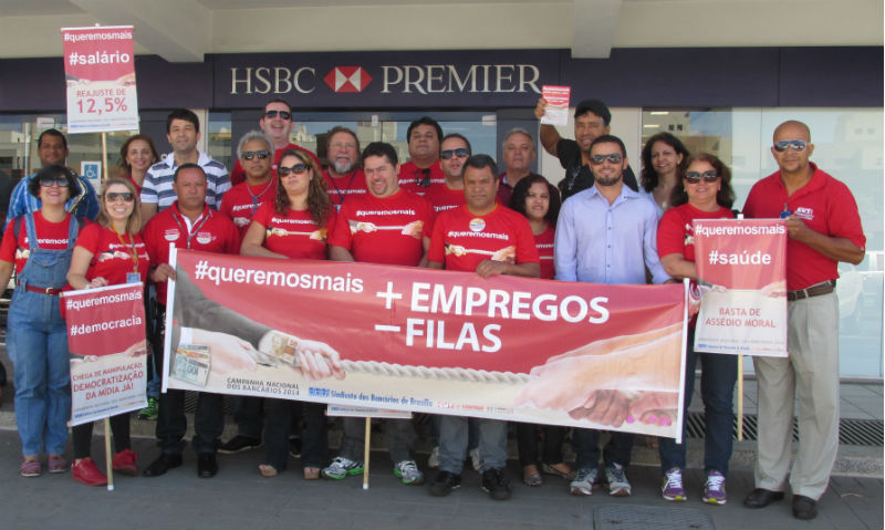 Bancários do HSBC lutam por mais contratações, fim das demissões imotivadas e valorização no Dia Internacional de Luta. Na sexta-feira (22), o Sindicato visitou várias agências do Distrito Federal para fortalecer a mobilização dos bancários por mais respeito da instituição.