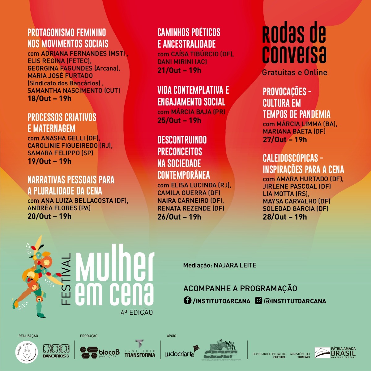 O Protagonismo Feminino nos Movimentos Sociais será destaque da abertura do evento. Nos demais dias serão abordados os temas Processos Criativos e Maternagem; Narrativas Pessoais para a Pluralidade da Cena; Caminhos Poéticos e Ancestralidade; Vida Contemplativa e Engajamento Social; Desconstruindo Preconceitos na Sociedade Contemporânea; Provocações – Cultura em Tempos de Pandemia; e Caleidoscópicas – Inspirações para a Cena.