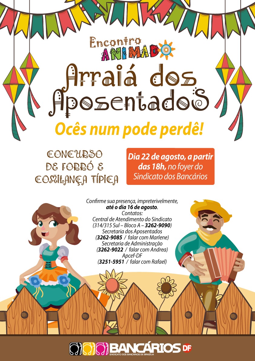 Se preparem que o tradicional Encontro Animado, com o Arraiá dos Aposentados, está chegando! A folia agostina será no dia 22 deste mês, a partir das 18h, no foyer do Sindicato (314/315 Asa Sul) e promete muita diversão e alegria. Haverá concurso de forró e comilança típica. O traje caipira é opcional.
