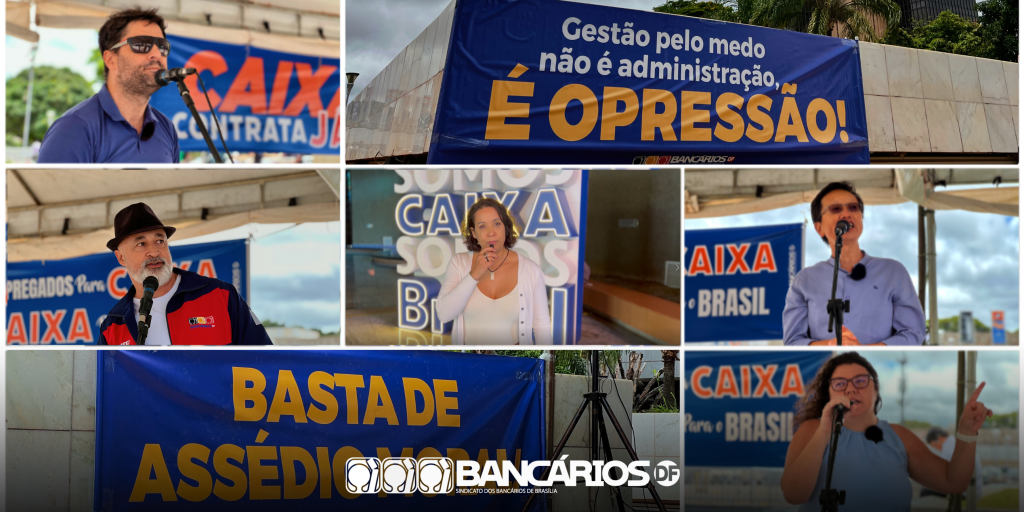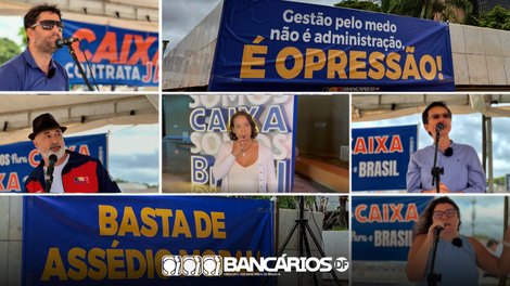 Em frente à matriz da Caixa Econômica Federal, o Sindicato dos Bancários de Brasília realizou um ato para marcar os 164 anos do banco público, destacando tanto a história de sua contribuição social quanto os desafios que seus empregados enfrentam diariamente.