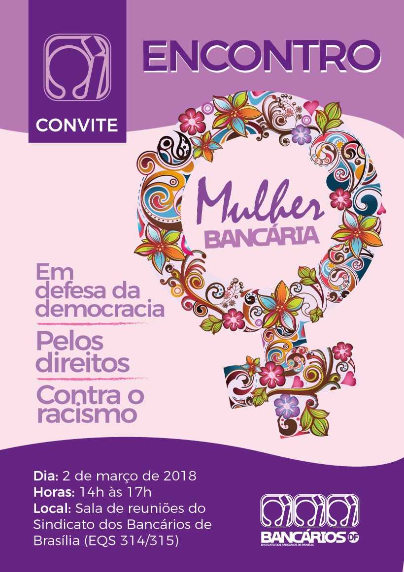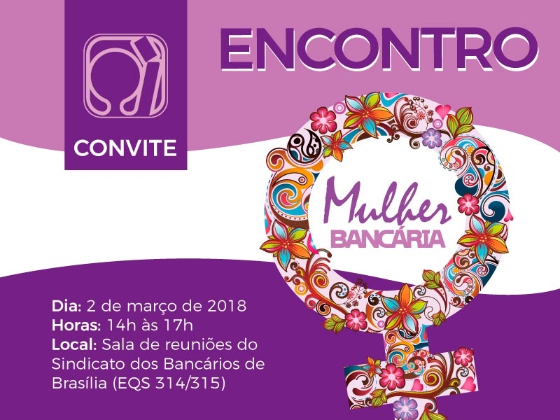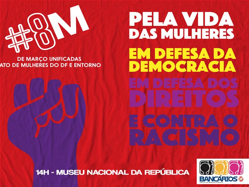 Para 8 de março, Dia Internacional da Mulher, o Sindicato convoca as bancárias e bancários a se somarem à manifestação organizada pela CUT/DF, entidades sindicais e movimentos populares, a partir de 14h, na concentração no Museu da República, pela vida das mulheres, contra o racismo, em defesa dos direitos e da democracia.