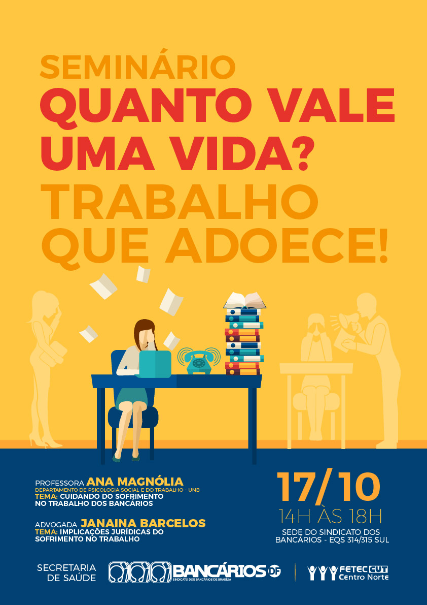 “Quanto vale uma vida – Trabalho que adoece!” é o tema do seminário que o Sindicato promoverá na próxima quarta-feira (17), das 14h às 18h, na sede da entidade (EQS 314/315 Sul). O evento será transmitido ao vivo pelas redes sociais do Sindicato.