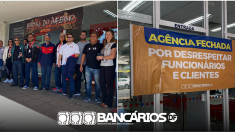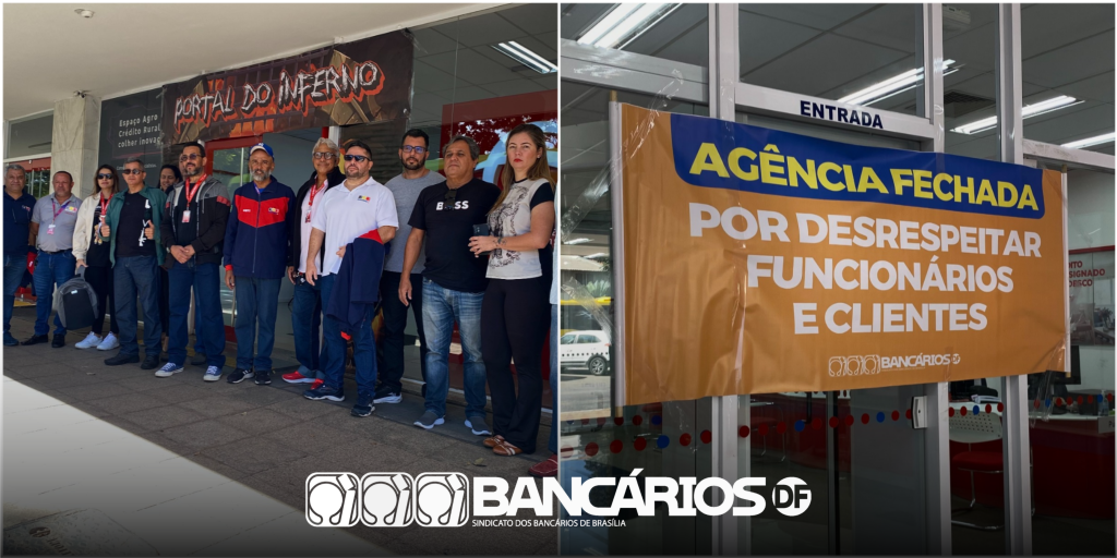 Em Brasília, a mobilização, que faz parte da Campanha Nacional 2024, que tem como um dos eixos a defesa do emprego, foi marcada pelo fechamento da agência da 504 Sul, no Plano Piloto, que recebeu o “Portal do Inferno”, uma forma de protesto do Sindicato para denunciar a dura realidade enfrentada pelos trabalhadores.