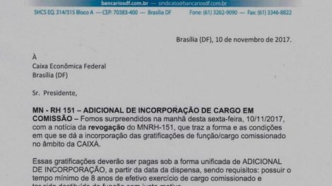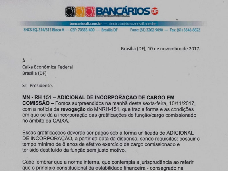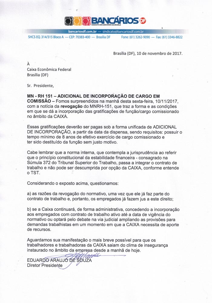 Diante desse novo ataque aos empregados, o Sindicato encaminhou ofício ao presidente da Caixa, Gilberto Occhi, questionando os motivos da medida. Primeiro porque o RH 151 já faz parte do contrato de trabalho e, portanto, os empregados fazem jus a esse direito. Além disso, o Sindicato quer saber se a Caixa continuará concedendo a incorporação administrativamente ou via judicial, o que implica a ampliação das provisões para demandas trabalhistas em um momento em que o banco necessita de aporte de recursos.
